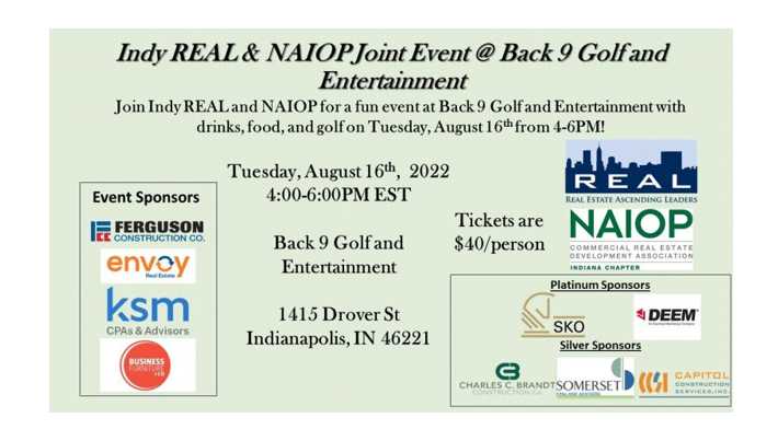 Come join Indy REAL & NAIOP for a joint happy hour event at the new Back 9 Golf & Entertainment facility near downtown Indy.