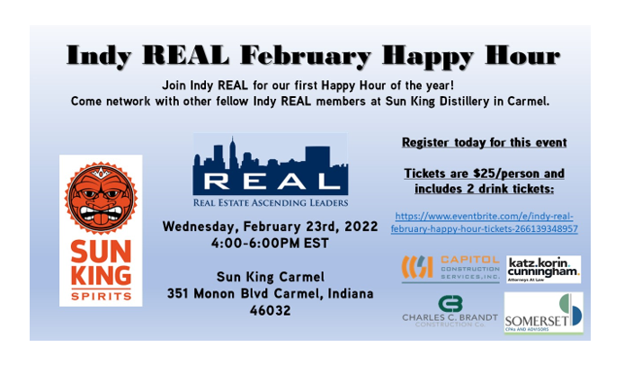 Join Indy REAL for the first Happy Hour of 2022! Join us at Sunk King Distillery in Carmel to connect and network with other fellow Indy REAL members.