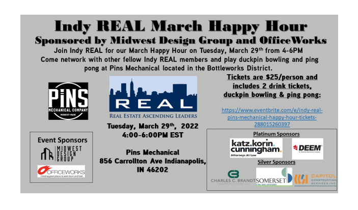 Join Indy REAL for the first happy hour of 2023 at Eight Eleven Group’s new building in Broad Ripple. Please see below a link to purchase tickets. We look forward to seeing everyone!