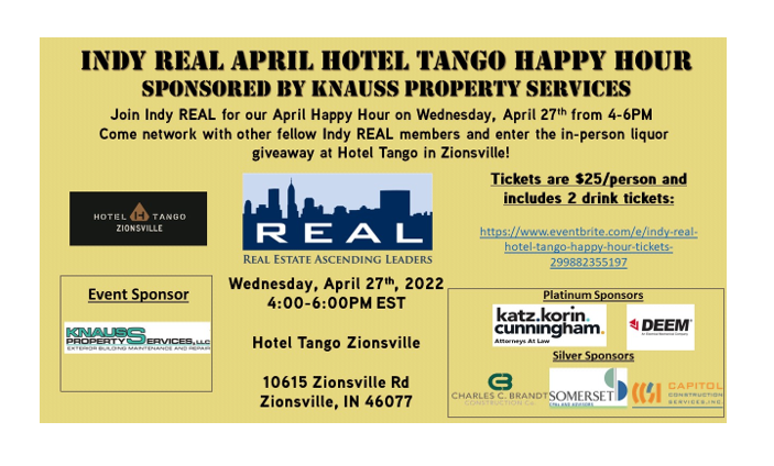 Join Indy REAL for our April Happy Hour. Network with fellow REAL members and enter the in-person liquor giveaway at Hotel Tango in Zionsville!
